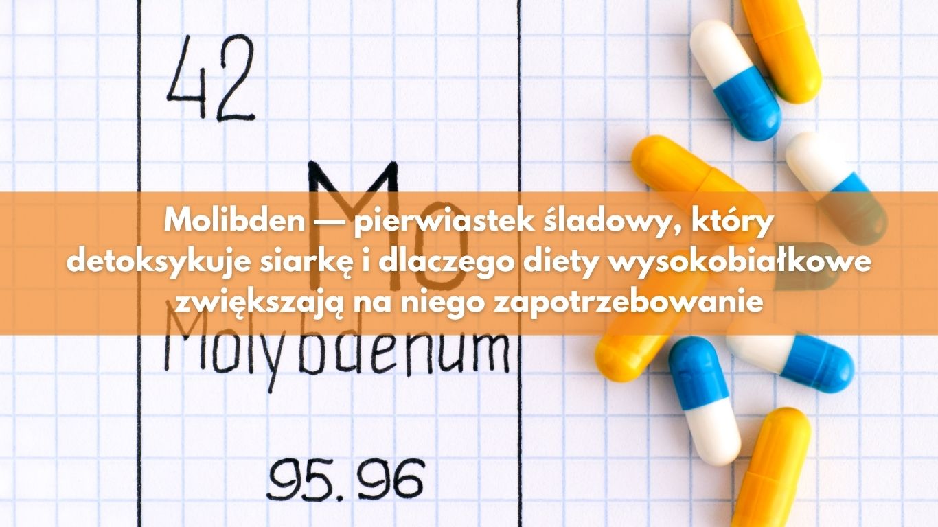 Molibden brzmi jak element tablicy Mendelejewa z lekcji chemii, a nie składnik diety. Tymczasem ten mikroelement jest niezbędny do działania co najmniej trzech enzymów, które na co dzień rozkładają toksyczne związki siarki i moczanów w Twoim ciele. Jeśli jesteś na diecie wysokobiałkowej — zapotrzebowanie na niego rośnie. Poniżej wyjaśniamy, jak działa, skąd go brać i kiedy warto rozważyć suplementację