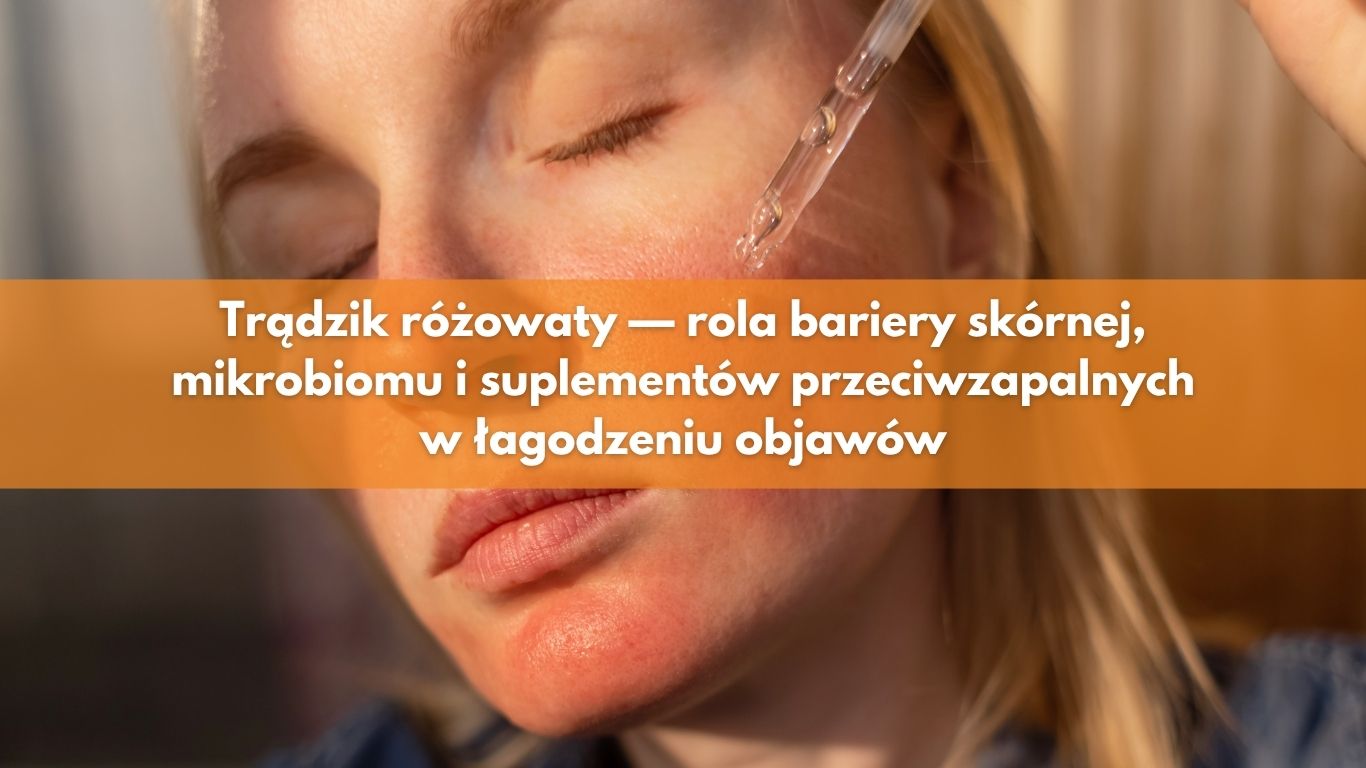 Trądzik różowaty (rosacea) jest przewlekłą chorobą zapalną skóry twarzy — z zaczerwienieniem, widocznymi naczynkami, krostkami i uczuciem pieczenia. Cierpi na nią ok. 5–10% populacji, a konwencjonalne leczenie skupia się głównie na objawach (antybiotyki, metronidazol, lasery). Tymczasem coraz więcej dowodów wskazuje, że rosacea to choroba z głębszymi korzeniami — zaburzoną barierą skórną, dysregulacją mikrobiomu skórnego i jelitowego oraz przewlekłym stanem zapalnym naczyń. Suplementacja może adresować te mechanizmy od środka. Poniżej przedstawiamy aktualną wiedzę.