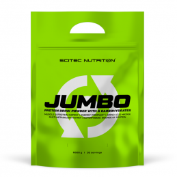 Scitec Nutrition Jumbo oznacza duży i silny, dowiedziono naukowo, że ludzie nie doceniają przyjmowania substancji odżywczych podczas diety, ale także przeceniają faktyczną konsumpcję żywności, gdy chcą zyskać masę mięśniową i siłę. Inaczej mówiąc jedzą mniej niż sądzą i potrzebują dla stałego i znaczącego postępu w treningu. Każdy poszukuje złotego środka ignorując fakt, iż nie ma niczego mocniejszego niż stała konsumpcja właściwych ilości kalorii, energetyzujących węglowodanów i budujących mięśnie protein. Jeśli weźmiemy pod uwagę, fakt iż wielu trenujących nie przeznacza wystarczającej ilości czasu i energii na prowadzenie dziennika diety, wtedy jedynym praktycznym rozwiązaniem jest codzienne stosowanie Jumbo firmy Scitec Nutrition, który dostarcza wystarczającej ilości składników odżywczych, aby osiągnąć doskonałe wyniki. 50g farmaceutycznej jakości protein w jednej porcji, duża dawka szybko i wolno uwalniających się węglowodanów zapewni odpowiednie odżywianie Twojego organizmu.