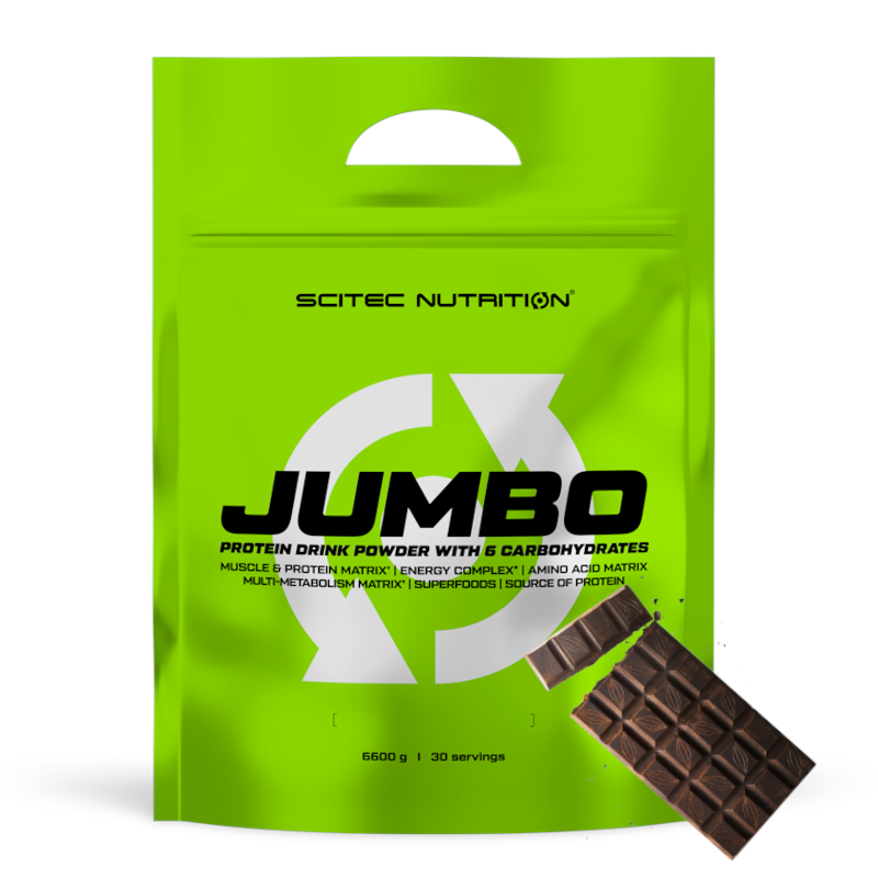 Scitec Nutrition Jumbo oznacza duży i silny, dowiedziono naukowo, że ludzie nie doceniają przyjmowania substancji odżywczych podczas diety, ale także przeceniają faktyczną konsumpcję żywności, gdy chcą zyskać masę mięśniową i siłę. Inaczej mówiąc jedzą mniej niż sądzą i potrzebują dla stałego i znaczącego postępu w treningu. Każdy poszukuje złotego środka ignorując fakt, iż nie ma niczego mocniejszego niż stała konsumpcja właściwych ilości kalorii, energetyzujących węglowodanów i budujących mięśnie protein. Jeśli weźmiemy pod uwagę, fakt iż wielu trenujących nie przeznacza wystarczającej ilości czasu i energii na prowadzenie dziennika diety, wtedy jedynym praktycznym rozwiązaniem jest codzienne stosowanie Jumbo firmy Scitec Nutrition, który dostarcza wystarczającej ilości składników odżywczych, aby osiągnąć doskonałe wyniki. 50g farmaceutycznej jakości protein w jednej porcji, duża dawka szybko i wolno uwalniających się węglowodanów zapewni odpowiednie odżywianie Twojego organizmu.
