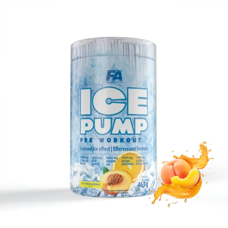 FA ICE Pump Pre workout 463g - jest to najwyższej jakości kompleksowy preparat przedtreningowy o orzeźwiającym smaku z myślą o maksymalnym pobudzeniu naszego organizmu do działania oraz nasilenia efektów treningowych poprzez zwiększenie pompy mięśniowej i przepływu makroskładników do naszych mięśni. Dzięki Ice Pumpowi poczujemy duży zastrzyk energii oraz poprawę w zakresie skupienia i koncentracji poprawiając tym samym swe wyniki na treningu czy też zawodach.