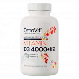 Produkt witaminowy OstroVit D3 4000 + K2 100tab zawiera w swoim składzie witaminę D3 w postaci cholekalcyferolu, oraz witaminę K2 w postaci menachinonu. Obie te substancje są niezbędne dla prawidłowego funkcjonowania organizmu i dla utrzymania optymalnego stanu zdrowia.
