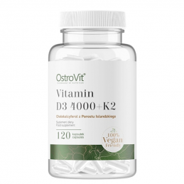 Ostrovit Vitamin D3 4000 K2 Vege jest to najwyższej jakości suplement diety, dostarczający nam niezbędnych do prawidłowego funkcjonowania witamin D3 oraz K2. Dwie substancje bardzo zależne od siebie, podane w wysoko przyswajanych przez ludzki organizm kapsułkach wegańskich.
