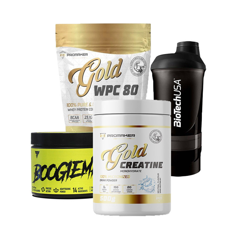 Produkty niezbędne w torbie każdej osoby zaczynającej swoją przygodę na siłowni. Mają na celu zwiększyć efektywność treningów oraz wspomóc regenerację nawet po najcięższej jednostce treningowej. Białko i kreatyna sprawią, że znacznie łatwiej zbudujesz siłę i masę mięśniową. Dodatkowo Suplement Przedtreningowy Boogieman, który połączony z trakcie treningu z kreatyną sprawi, że będziemy mieli dodatkową energię, niezbędne pobudzenie oraz dodatkową motywację. To wszystko jeszcze bardziej ułatwi nam osiągnięcie zamierzonego celu i spotęguje działanie pozostałych produktów. Dodatkowo do zestawu dołączono 3 częściowy shaker firmy BiotechUSA, gdzie będziemy mogli wszystko wygodnie nosić w torbie treningowej.